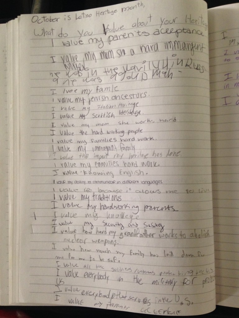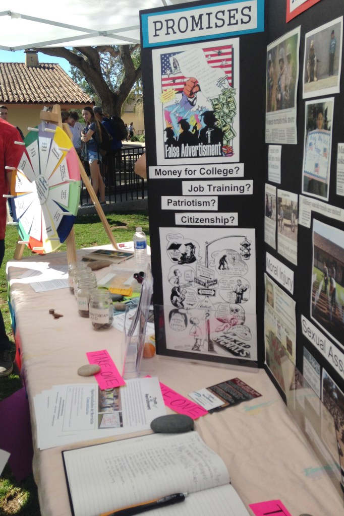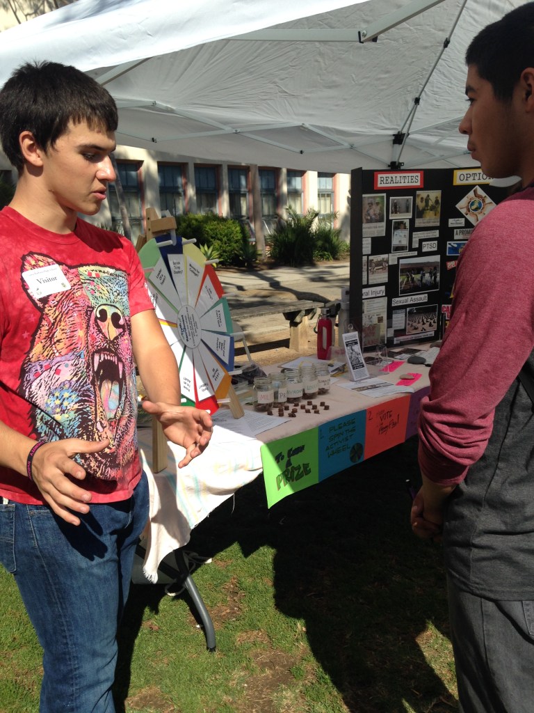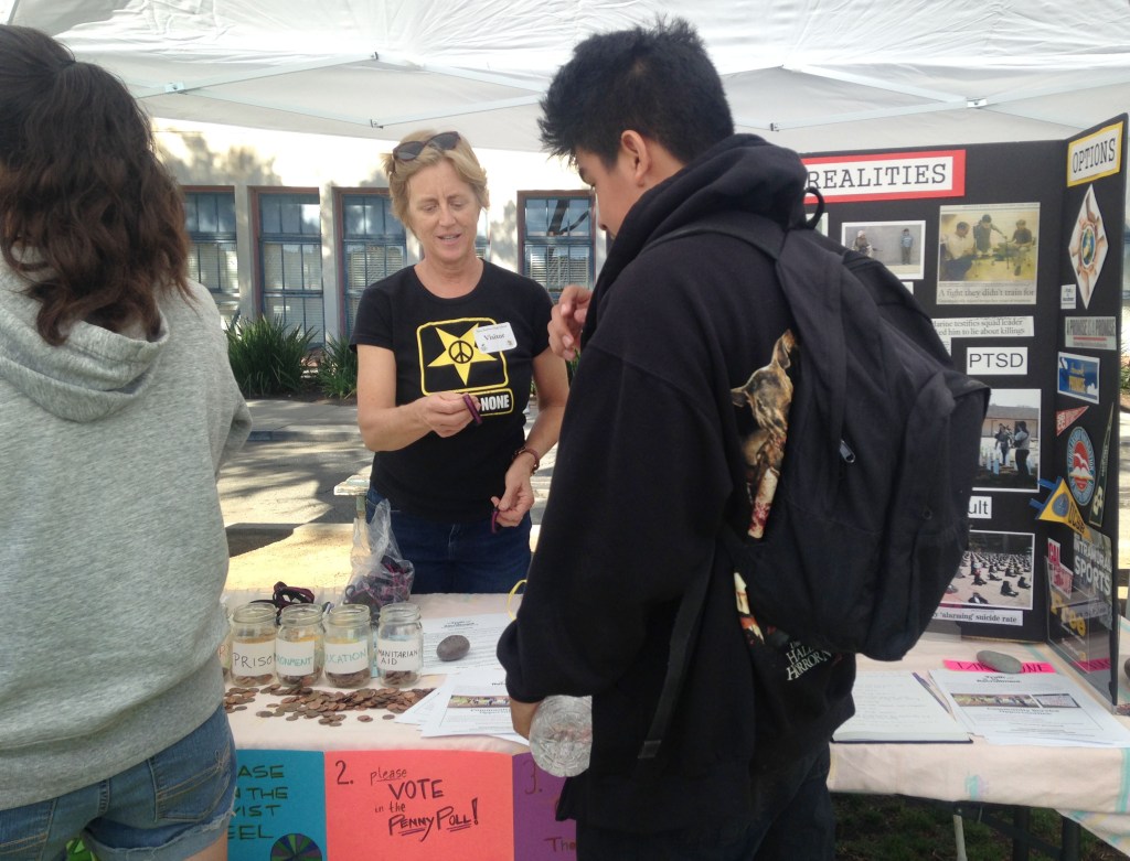On a Friday morning, October 27, at Santa Barbara High School, I joined Fernando and Kate during Santa Barbara High School’s Community Service Fair. As I arrived at the Truth in Recruitment table, students were swarming around while asking questions and playing games. At the Wheel of Fortune, Fernando and students were talking about the financial realities of a military career and other questions posed by the wheel. Kate guided a small group to ‘vote with their dollars’ as if they were members of Congress deciding how to allocate funds for the national budget. Students doled out the coins while considering the consequences of distributing money between education, humanitarian aid, environment, the prison system and the military. In a comment book, people took turns writing about the ways they are proud of their heritage. All these young people walked away with bracelets that read: Question Authority.