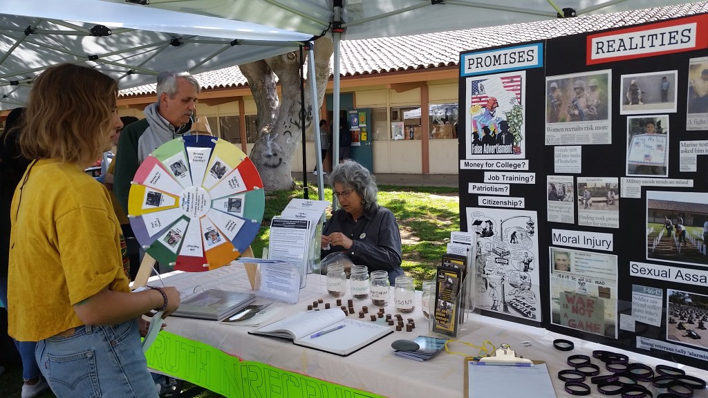 My time at Santa Barbara High School working with Truth in Recruitment was satisfying and it felt like we (Lisha) and I made a big splash. Many students were at the table and we spoke to a great many and had several penetrating conversations. The students were open to what we had to say and they answered our many prodding questions about what they know about the military and about their plans for the future. We were badly needed and outnumbered, so it was nice to have Americorp there as “an alternative” in addition to reminding them at SBCC is free for them. I greatly appreciated all the work that Kate and Lisha have done with all the games, the posters and information. The buttons, literature and games were magnets, and provided an “in” into their thinking about the military and whether they wish to join it. Quick suggestion: I would have a poster with at least six alternatives to the military. I was unsure whether or not the game which is a “wheel” was ever used, most of the students did not know the people on it. Perhaps a few basics on “THE MILITARY” and its environmental record, since all the students indicated concern for the environment.