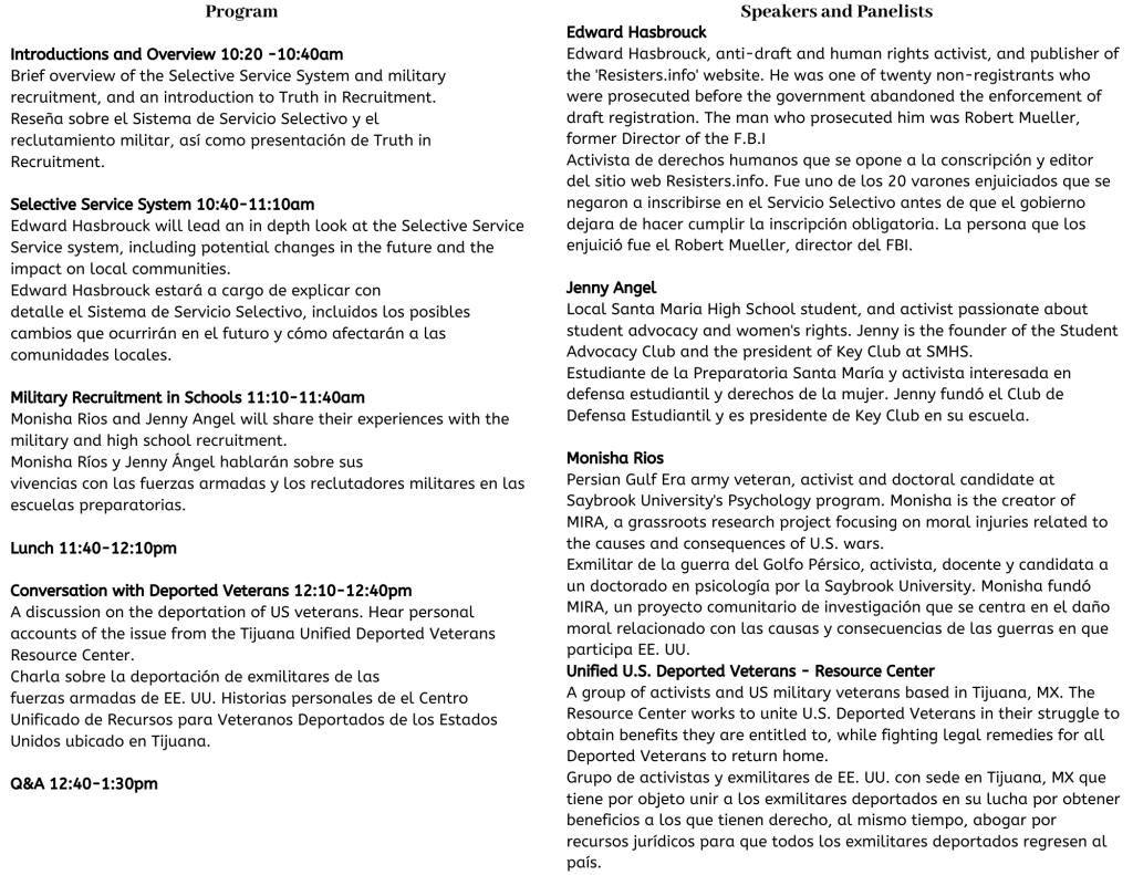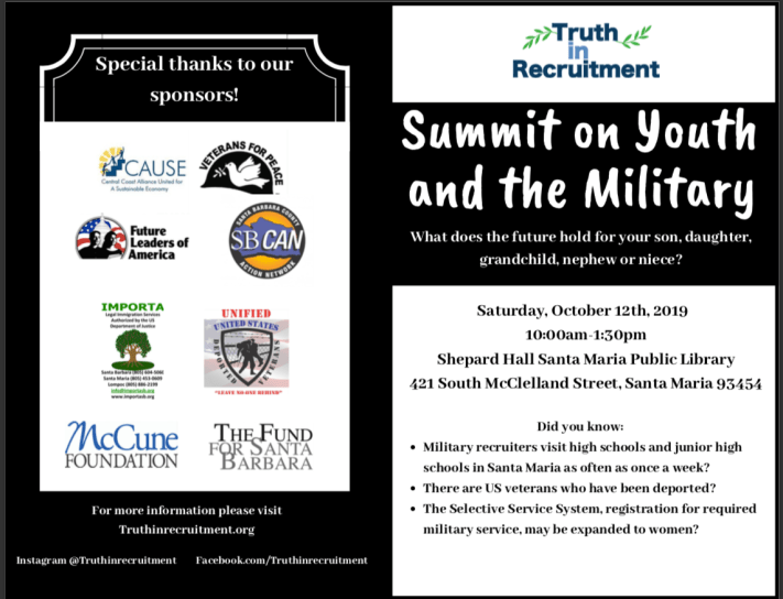 On October 12 in the Santa Maria Public Library, I was the emcee for Truth in Recruitment’s Summit on Youth and the Military. We had different panelists talking about the Selective Service System, their experiences in the US Army, as well as members of the Unified U.S. Deported Veterans Support House in Tijuana. We started off by having an equity walk led by Santa Maria High School (SMHS) student Jenny. While she was doing the activity, I noticed how students and adults saw more military recruiters than seeing different colleges in high schools. This made me realize that nothing has CHANGED since adults went to high school! Recruiters are mainly recruiting students that are low income because students are scared, they can’t go to college because of money. I go to SMHS and we are mainly low income and the lowest school cohort that has passed the A-G requirement than Pioneer Valley (PVHS) and Ernest Righetti High Schools. Military recruiters inform us about the “good” in the military.