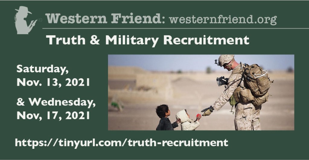 In 2011, we were living in Santa Barbara, and my son was a high school freshman. He told me one day about how he had challenged a Marine recruiter in his Freshman Seminar Class (devoted to learning about careers). At first, I was impressed that he felt brave enough to question a military recruiter. Then I thought, “Why was there a recruiter in his Freshman Seminar Class at all?” This recruiter was not just standing at a table in the hallway; the recruiter was interrupting my son’s education. After reaching out to other parents and doing some research, I learned that under the federal No Child Left Behind/Every Child Succeeds Act, schools must provide military recruiters the same access as college and job recruiters in order to receive federal funding. Schools often interpret this as unrestricted access. But school districts can set policies that regulate military recruiter access as long as it applies equally to all types of recruiters. Working with Santa Barbara Unified School District (SBUSD), a group of students, parents, veterans, and members of the Santa Barbara Friends Meeting was able to get a policy passed in the SBUSD that limits recruiters to two visits a year and doesn’t allow recruiters to collect contact information directly from students. The group I helped found, Truth in Recruitment, came out of this campaign and is continuing this effort in nearby Santa Maria.